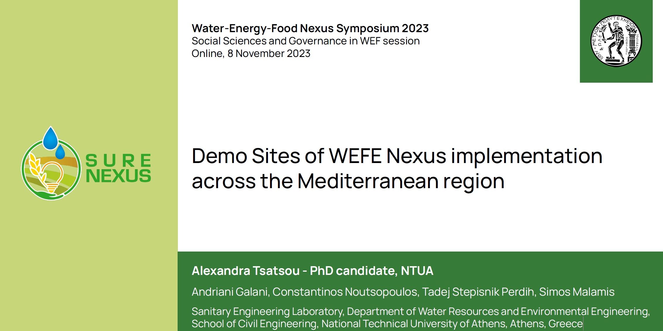 The National Technical University of Athens (NTUA) participated in the symposium by representing the SURE NEXUS project. NTUA’s presentation focused on Demo Sites of WEFE Nexus implementation across the Mediterranean region. This presentation aimed to showcase practical examples of how integrated approaches can effectively address the complexities of water, energy, and food systems within specific geographical contexts.